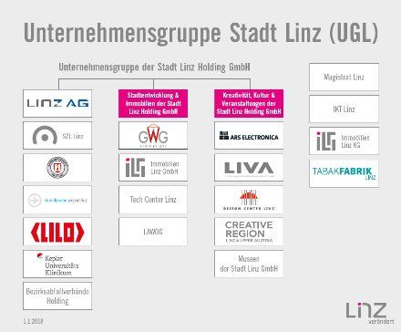 Aufgrund der bestehenden Unternehmenszwecke der städtischen Beteiligungen ist es in der neuen Unternehmensgruppe Linz Holding zur Gründung von zwei Branchenholdings in der Rechtsform einer GmbH kommen, die folgende UGL-Gesellschaften bzw. Beteiligungen beinhalten: